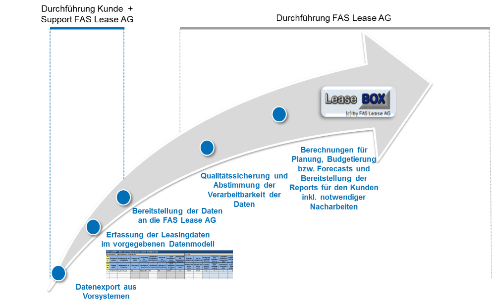 Mit der Leasingbilanzierung und der Notwendigkeit einer eigenen Softwarelösung ist ein nicht zu unterschätzender Aufwand im Abschlussprozess verbunden. Wir bieten daher neben der Implementierung unserer Leasing-Software „FAS LeaseBOX“ auch die Übernahme der Leasingbuchhaltung durch unsere erfahrenen Leasingexperten an („Managed Service“). Ihre Mitarbeiter werden somit operativ spürbar entlastet und die Nutzung eines zusätzlichen IT-Lösung entfällt. Außerdem unterstützen wir Sie bei der Sicherstellung der Datenqualität, Auslegungsfragen des Standards und stellen Ihnen die benötigten Auswertungen fristgerecht und qualitätsgeprüft zur Verfügung.